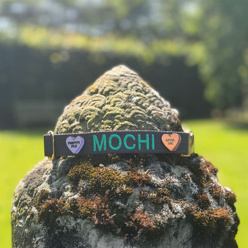 Now the fun part! We carefully attach your selected pins, adding a playful and personal design to your dog’s collar.