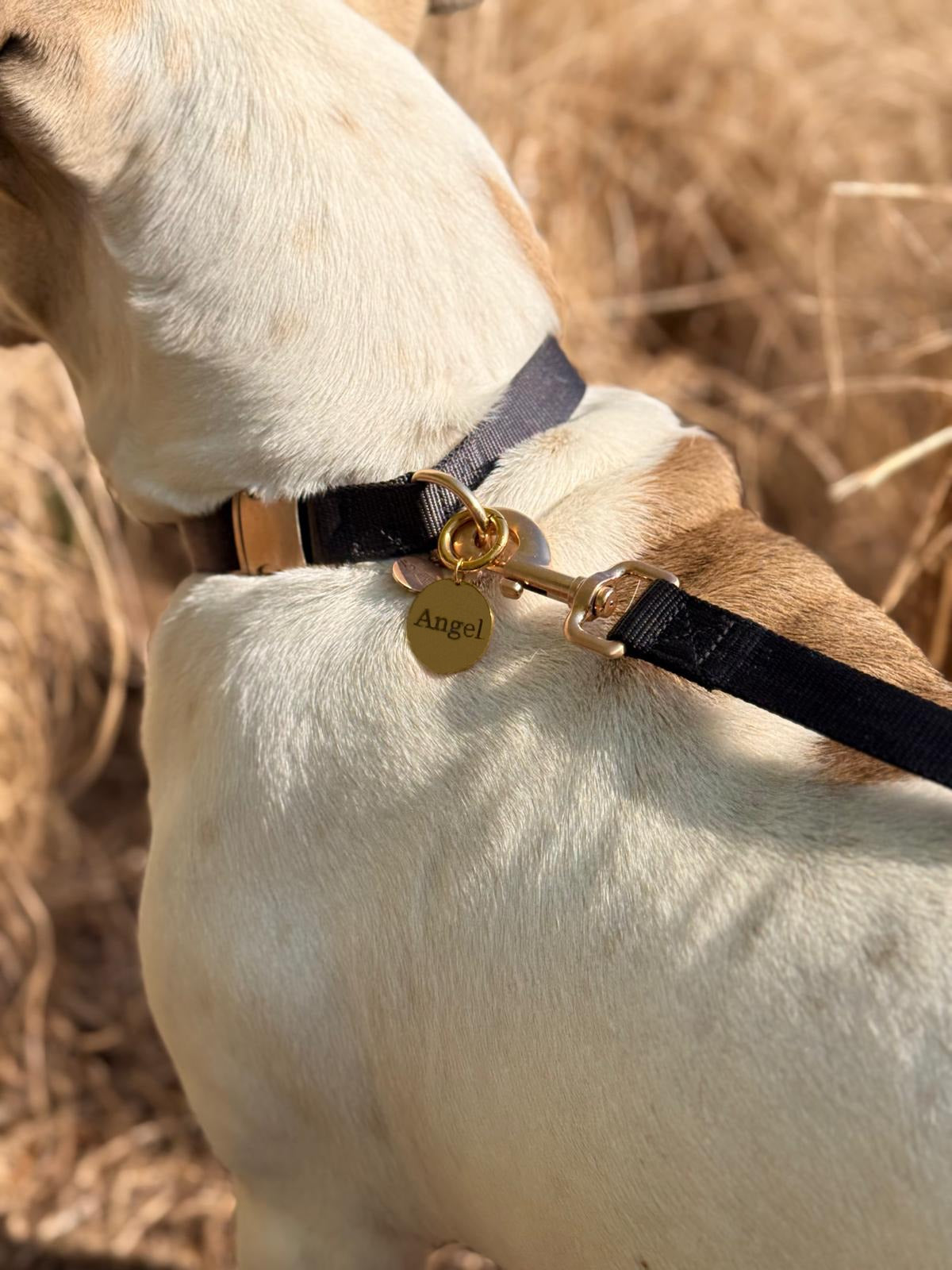 It allows for sleek, polished finishes (like gold tones!) while remaining rust-resistant and comfortable for your dog to wear. It’s also lighter than steel or brass, making it ideal for daily use.