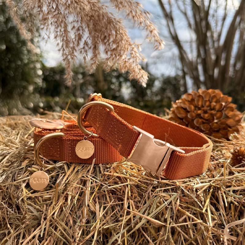 The Honey Drift Collar combines honey-cognac nylon and gold-tone hardware, offering both style and durability. The fray-resistant material and secure clasp provide comfort and a snug fit, ideal for daily wear or outdoor adventures. Personalize it with tags, embroidery, or pins to reflect your pet’s personality.