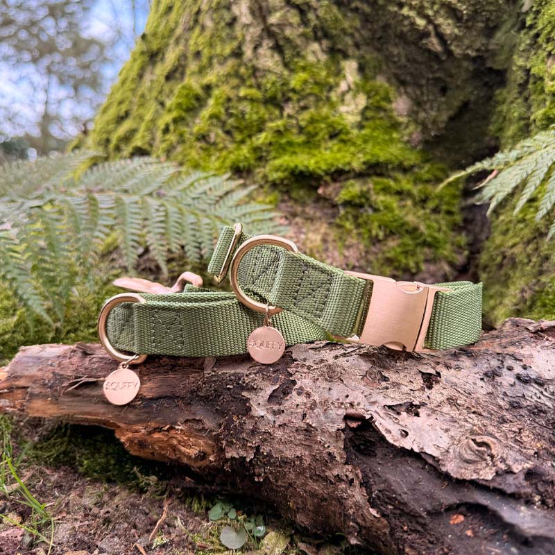 The Moss Breeze Collar blends durable olive-green nylon with gold-tone hardware, offering a stylish yet rugged design for larger pets. Lightweight and comfortable, it’s perfect for outdoor adventures and daily wear. The fray-resistant material and secure clasp provide a snug fit. Customize it with tags, embroidery, or pins to showcase your pet’s personality.